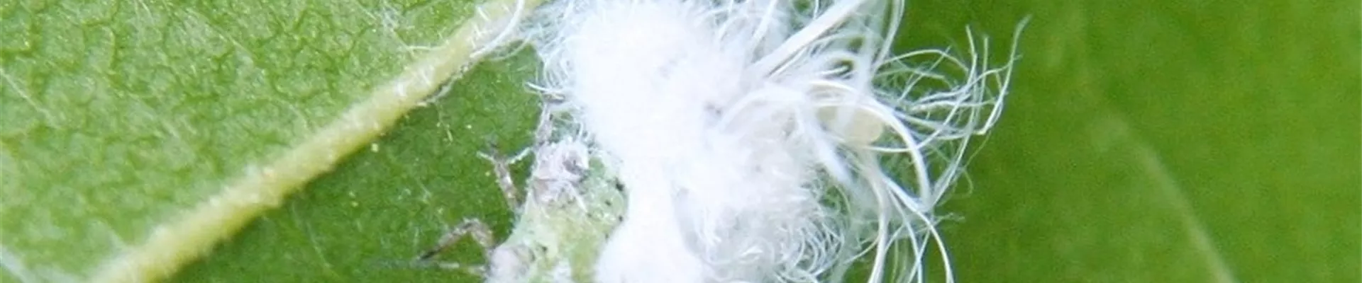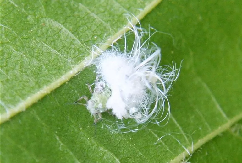Diese zuckerhaltigen Ausscheidungen findet man als kleine Tröpfchen, die von einer feinen Wachsschicht umhüllt sind, in der Nähe der Blattsaugerkolonien.