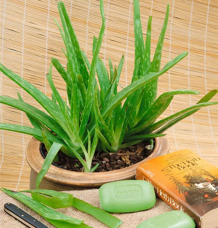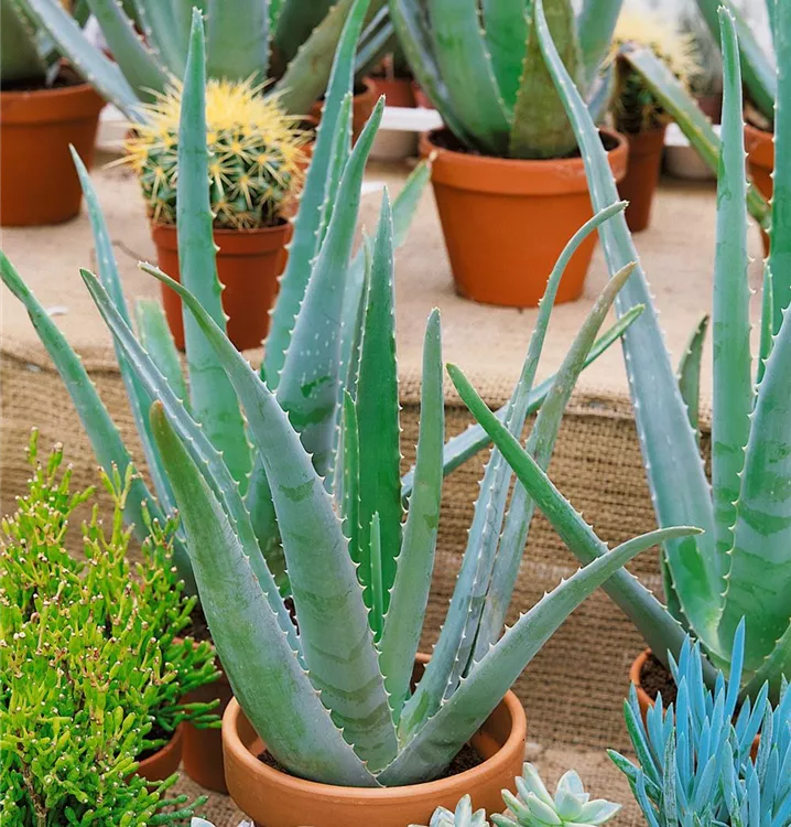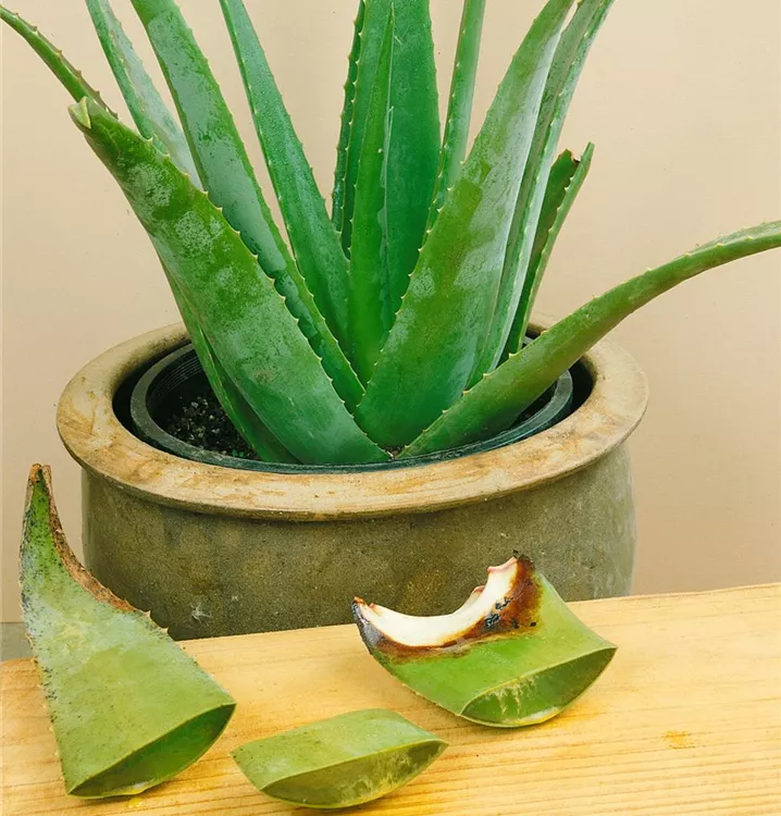 Die Echte Aloe (Aloe vera) zählt zu den pflegeleichten Pflanzen und besitzt hellgrüne, dickfleischige Blätter. Diese rosettenartige und sukkulente Pflanze gedeiht am besten an einem sonnigen Standort.