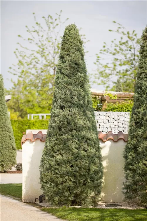 Säulen-Arizona-Zypresse 'Fastigiata' ist ein kegelförmig und dicht wachsender Kleinbaum. Sie erreicht gewöhnlich eine Höhe von 6 - 8 m und wird ca. 2 - 3 m breit.