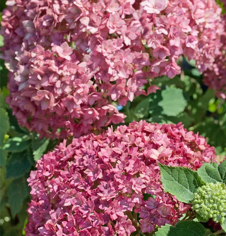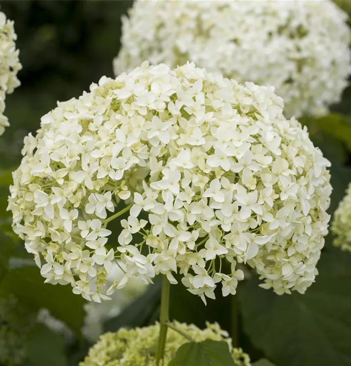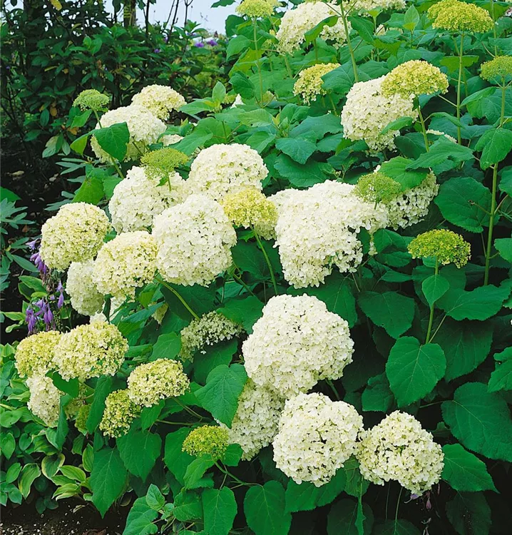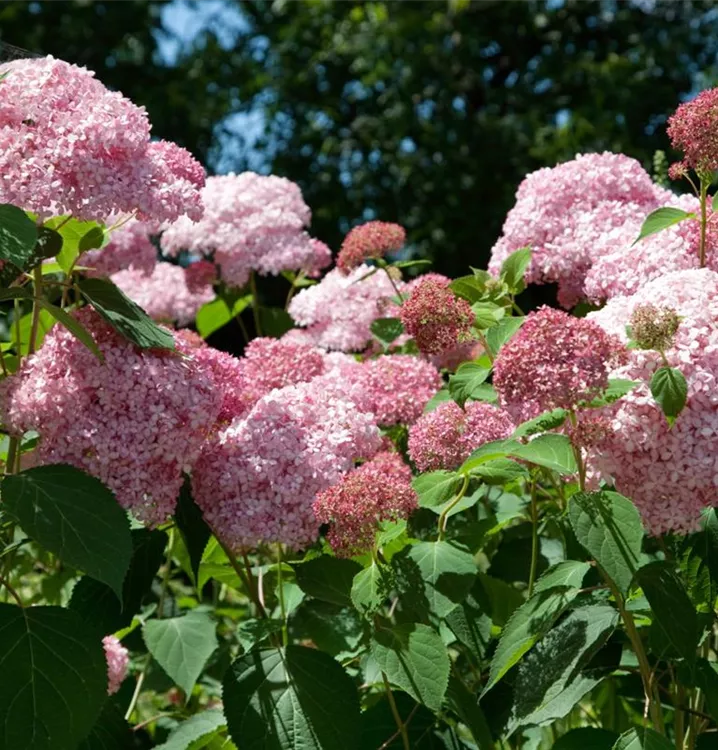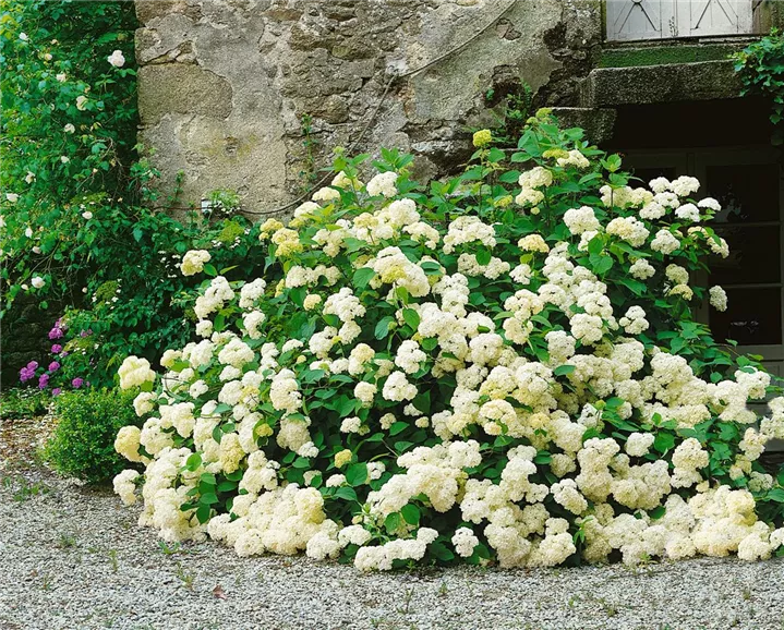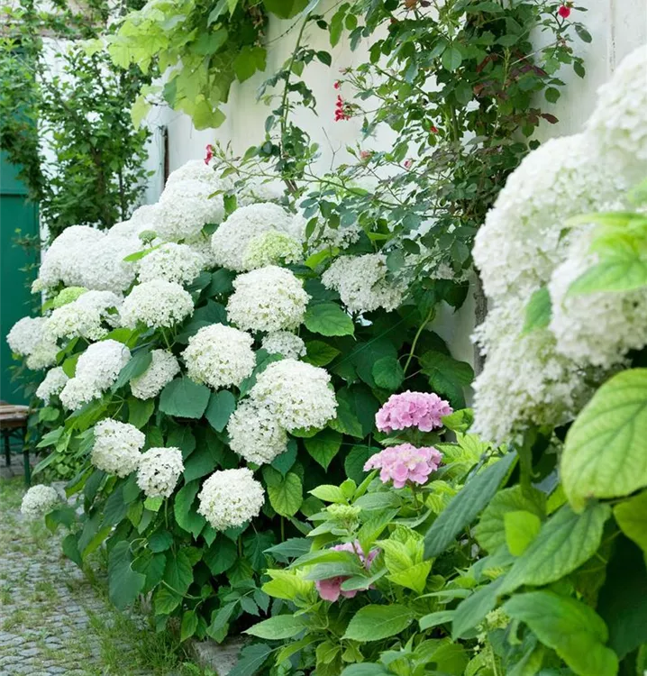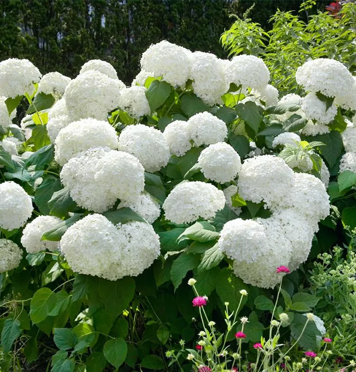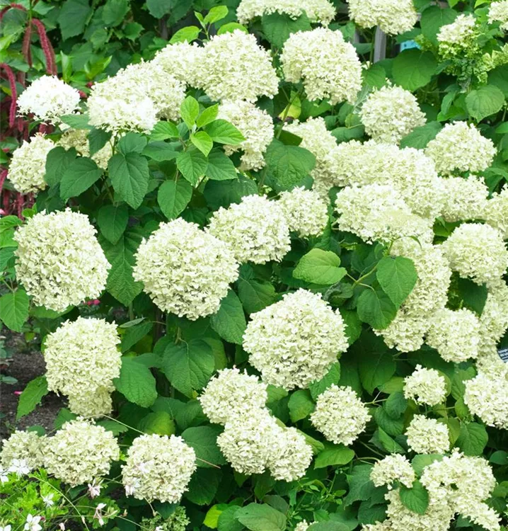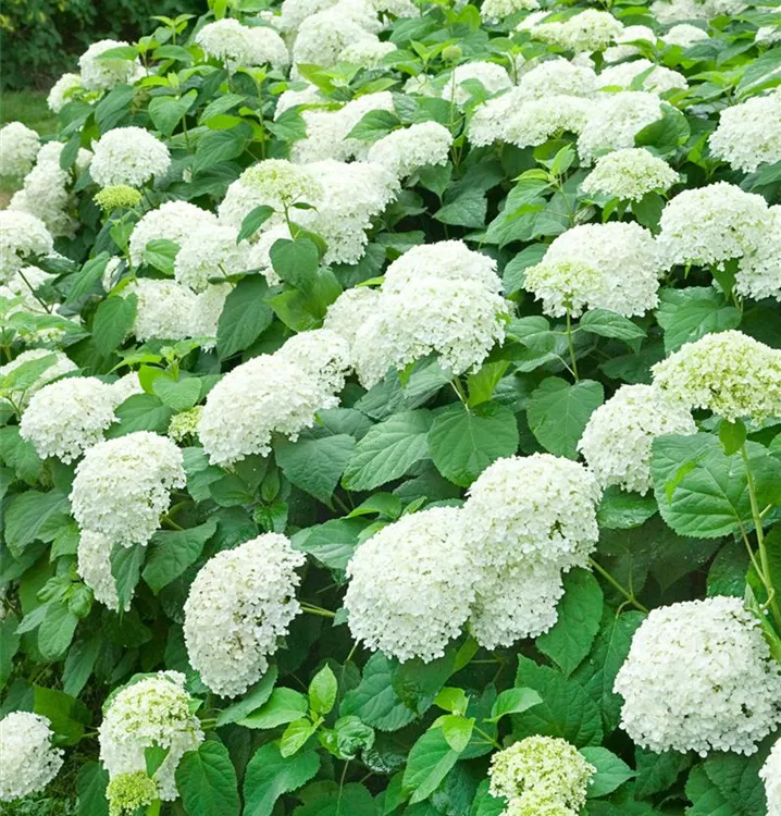 Die Strauch-Hortensie (Hydrangea arborescens) ein Strauch, der, je nach Sorte, ballförmige Blüten in verschiedenen Farben hervorbringt. An einem sonnigen bis halbschattigen Standort mit durchlässigem, humosem, saurem Boden erreicht sie gewöhnlich eine Höhe von ca. 3 m und wird ca. 2 m breit.