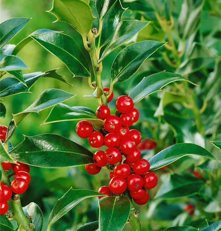 Besonders dekorativ sind die roten Steinfrüchte von Ilex aquifolium. Diese erscheinen ab Oktober.Haften sehr lange.