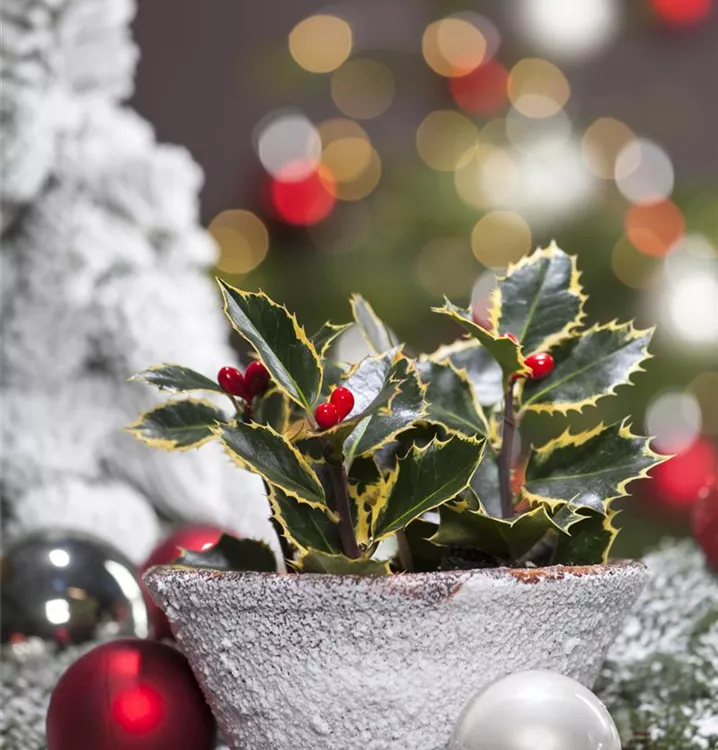 Die Gemeine Stechpalme (Ilex aquifolium) ist ein ausladender, pyramidaler Großstrauch mit dekorativen, roten Früchten, die sehr lange haften. Die Blüten erscheinen je nach Sorte in verschiedenen Farben.
