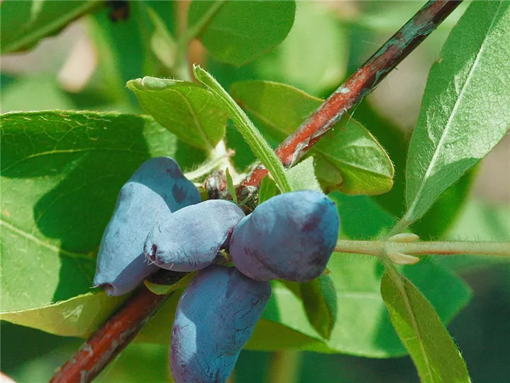 Die Blaue Heckenkirsche 'Fialka' (Lonicera caerulea var. kamtschatica) bildet blaue Beeren. Diese sind süß im Geschmack. Für eine ertragreiche Ernte ab Mai schaffen durchlässiger, humoser, kalkfreier Boden und ein sonniger bis halbschattiger Standort optimale Bedingungen. Auch ihre weißen, leicht duftenden Blüten sind eine schöne Erscheinung.