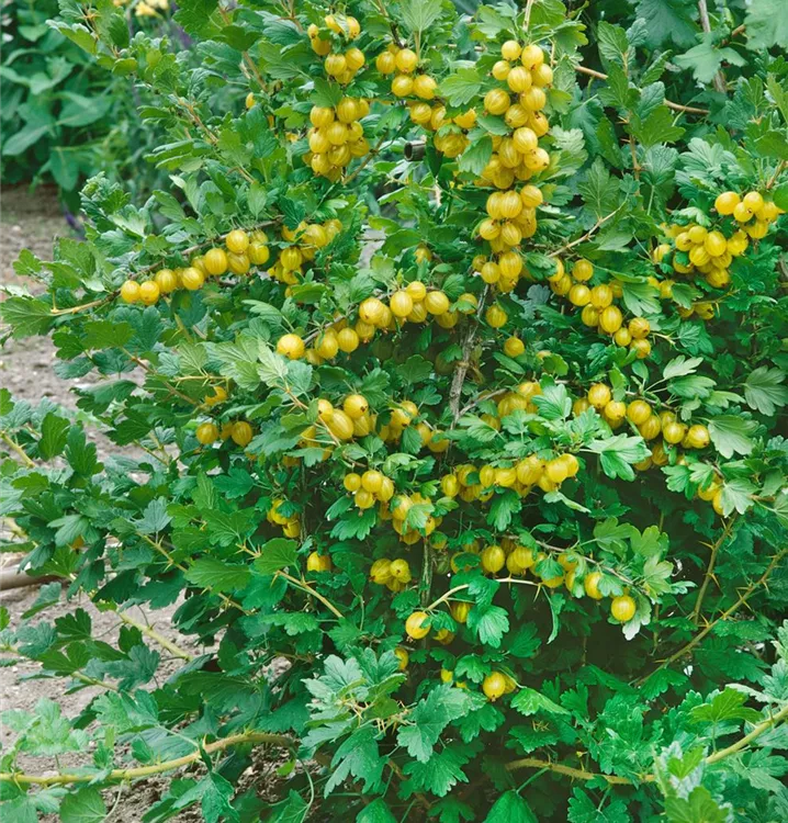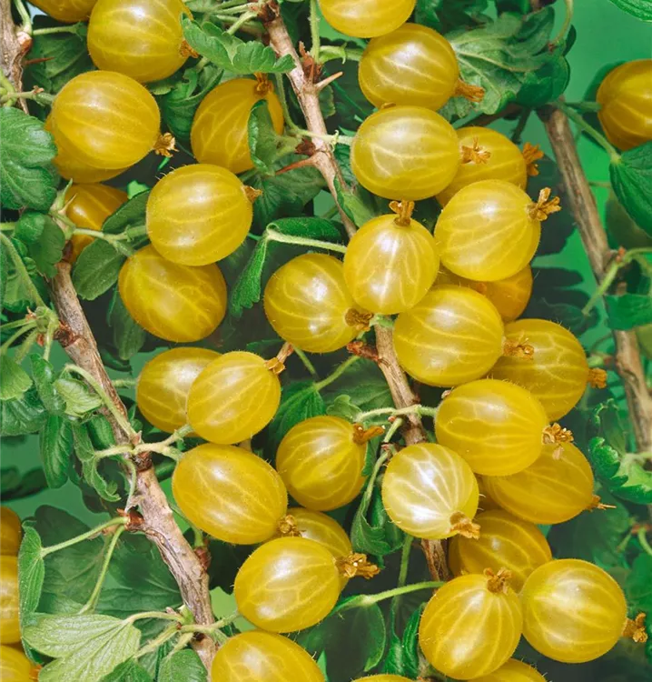 Die Stachelbeere (Ribes uva-crispa) bildet grüngelbe Beeren. Diese sind süß im Geschmack. Für eine ertragreiche Ernte ab Juli schaffen durchlässiger, lockerer, nährstoffreicher Boden und ein sonniger bis halbschattiger Standort optimale Bedingungen. Auch ihre weißen Blüten sind eine schöne Erscheinung.