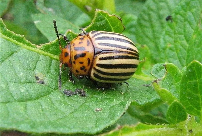 Der Kartoffelkäfer (Leptinotarsa decemlineata) überwintert im Boden. Im Frühjahr beginnt er mit seiner Fraßtätigkeit. Die orangegelben, ovalen Eier werden in Gruppen an die Blattunterseite gelegt. Aus ihnen schlüpfen die gefräßigen Larven.