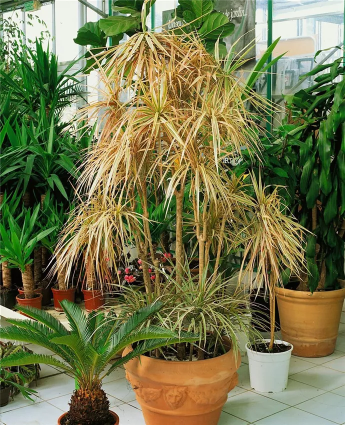 Pflegeleicht und mit skulpturaler Wirkung präsentieren sich die Vertreter der Drachenbäume ( Dracaena ), die leicht bis zu zwei Meter hoch werden. Für Dschungelambiente sorgt der Baumfreund ( Philodendron ), während buschig wachsender Bambus ( Bambusa ) für exotisches Asia-Flair steht. Filigrane Zimmerlinden ( Sparmannia africana) fügen sich perfekt in klassische bis rustikale Landhaus-Interieurs ein, während die Riesen-Alokasie ( Alocasia macrorrhiza ) mit ihrer grafischen Ausstrahlung jede moderne Wohnwelt bereichert. Ein besonderer Hingucker ist die Glückskastanie ( Pachira aquatica ), auch Wilder Kakaobaum genannt. Oft werden mehrere Pflanzen zu einem Stamm geflochten, was ihr ein besonders apartes Erscheinungsbild verleiht. Zwischen zwei Wassergaben sollte man die Erde gut trocknen lassen; auf Staunässe reagiert sie sehr empfindlich. Auch Zypergras ( Cyperus ) kann zu einem stattlichen, bis anderthalb Meter hohen Mitbewohner heranwachsen. Pflegeleicht und anspruchslos, muss man bei Zypergras darauf achten, ausreichend zu gießen, denn es zu den ganz wenigen Zimmerpflanzen, die Staunässe nicht übel nehmen – im Gegenteil! Attraktiv ist Zypergras dank seiner eleganten Wedel auch in Solitärstellung.