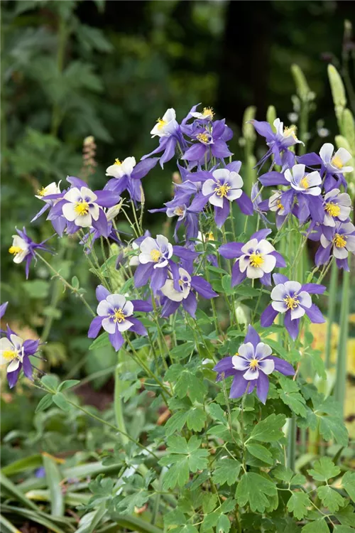 Aquilegia caerulea bildet glockenförmige, zweifarbige Blüten ab Mai. Diese werden etwa 7 - 8 cm groß.