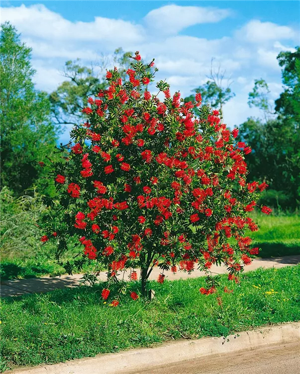 Callistemon citrinus, Stamm bildet während der gesamten Saison zahlreiche rote Blüten. Bei richtiger Pflege Nachblüte im Februar.