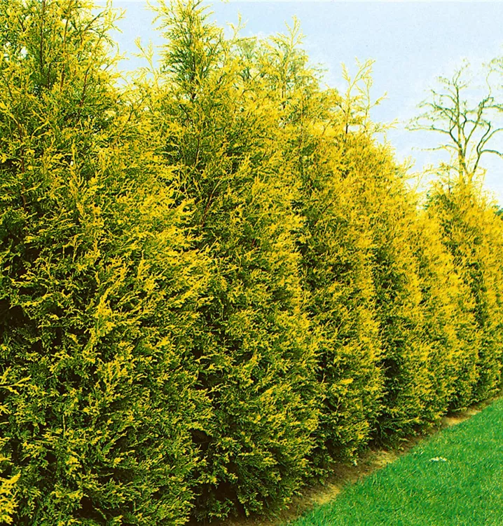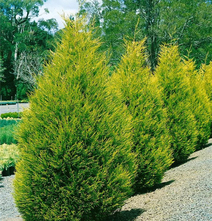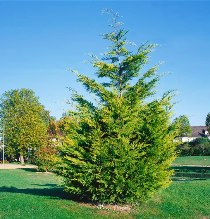 Gelbe Baumzypresse 'Castlewellan Gold' ist ein aufrecht und schlank wachsender Baum mit geschlossener Krone. Sie erreicht gewöhnlich eine Höhe von 7 - 15 m und wird ca. 2 - 3 m breit.