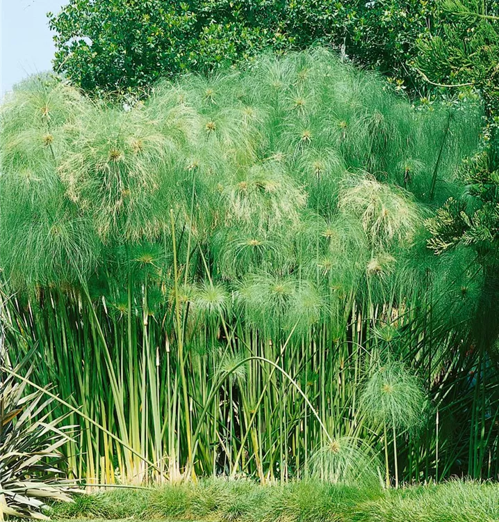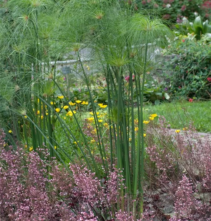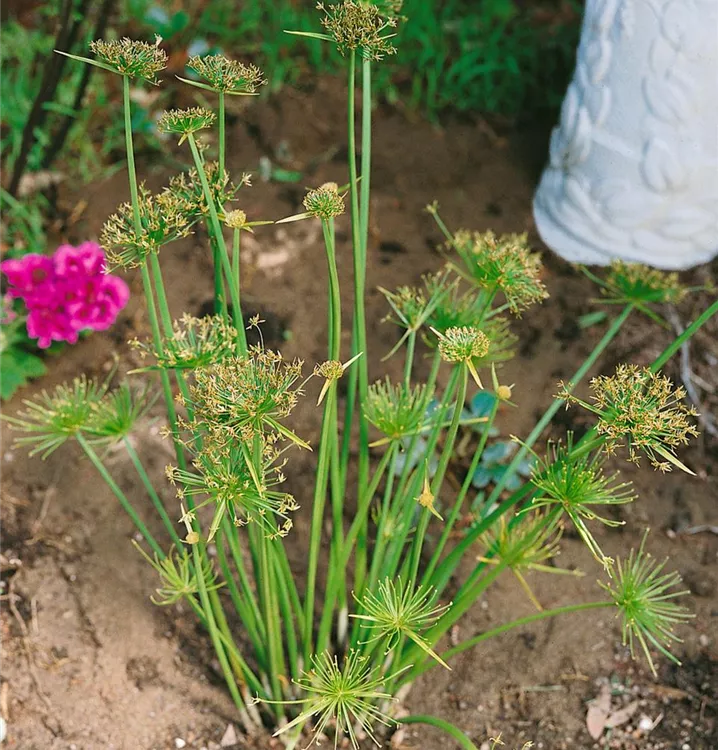 Das Zypergras (Cyperus albostriatus) ist eine sehr beliebte Kübelpflanze. Seine dekorativen Blüten erscheinen von Mai bis Juni. Verwenden Sie bevorzugt die spezielle Kübelpflanzenerde, denn sie verdichtet sich über längere Zeit nicht.
