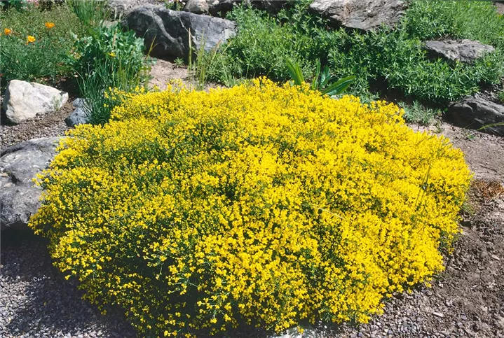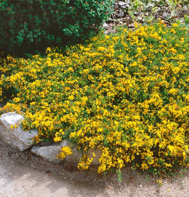 Die Sandginster (Genista pilosa) ein dichter, kompakter Zwergstrauch, der, je nach Sorte, Blüten in verschiedenen Farben hervorbringt. An einem sonnigen bis halbschattigen Standort mit humosem, sandigem Boden erreicht sie gewöhnlich eine Höhe von ca. 40 cm und wird ca. 50 cm breit.