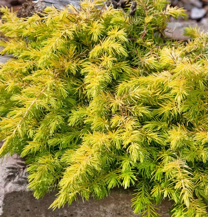 Der Strand-Wacholder 'Allgold' ist immergrün. Seine Nadeln sind gelb, schuppenförmig.