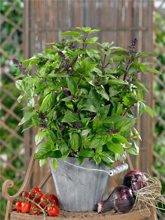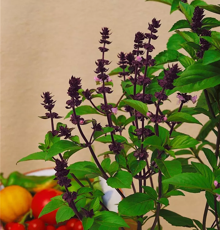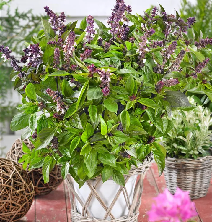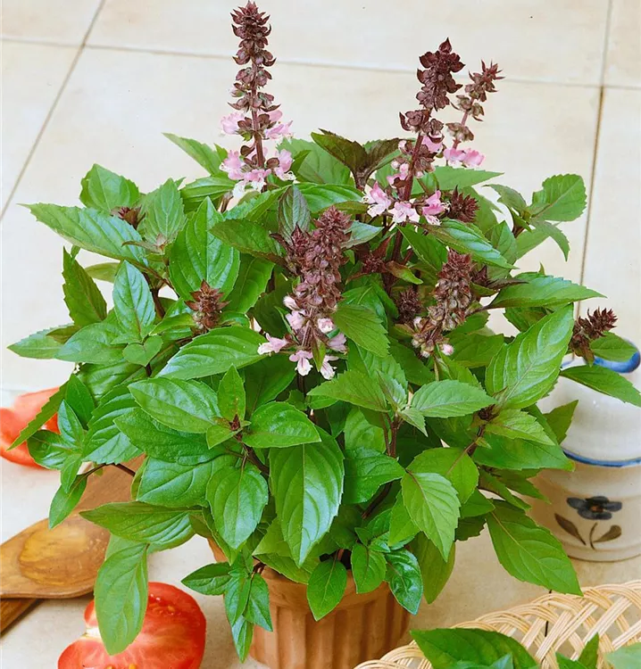 Das Zimt-Basilikum 'Cinamonette' (Ocimum basilicum) ist eine Kräuterpflanze mit einem würzigen Geschmack. Für das optimale Wachstum des Zimt-Basilikums 'Cinamonette' werden ein sonniger Standort und durchlässiger, nährstoffreicher Boden benötigt.