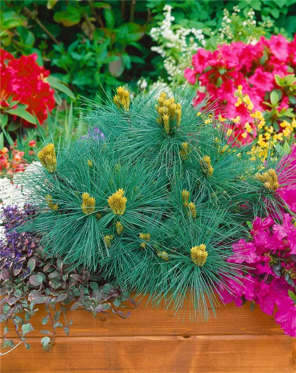 Die Seidenkiefer 'Macopin' ist immergrün. Ihre Nadeln sind blau-grün, weich.